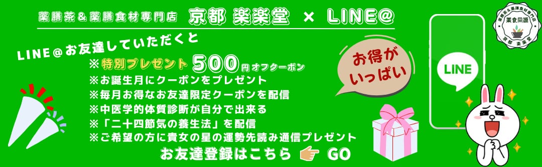 春におすすめの薬膳茶 本格的なダイエットをする前にお腹の調子を調える、そろそろダイエット茶が登場! 冬眠から目覚めた動物たちは雪をかき分け山菜の新芽を食べてデトックスします。それが自然界の法則。私たちもそれに習い、お腹を温め、冬の溜め込んだ邪気を解毒して身体を調え、本格的なダイエットに備える時です。効率よくダイエットを進めるためにまずはお腹の調子を調えることが大切です。また、冷えタイプで鼻水がツーと流れる花粉症にも。 すっきりとした飲み心地が嬉しいポイントです。ノンカフェイン、香料 着色料 甘味料など 一切不使用、日本国内 生産加工。 名称:そろそろダイエット茶15包入 原材料名:杜仲茶、なつめ、生姜、黒豆、陳皮 内容量:5.5g入りティーバッグ×15包入 総重量:約100グラム 賞味期限:パッケージに記載 保存方法:冷暗所にて保存 生産加工地:日本国内(京都市内) 製造者:株式会社リージュ 京都楽楽堂 京都府京都市 備考: ティーバック入りですので、カップに入れてお湯を注いでお召し上がり下さい。 200㏄ぐらいのカップなら2~3煎ぐらい召し上がれます。 750㏄ぐらいのポットや水筒なら一包でも十分美味しく抽出できます。 ノンカフェイン 「そろそろダイエット茶15包入」をご注文の場合、追跡可能メール便で日本全国送料無料にて発送いたします。 当店では、品質保持のため受注後一包ずつまた一袋ずつ生産加工しております。 ですので発送の目安は最長7営業日(土、日、祝、不定休日除く)以内とさせていただいております。 カビや虫などの発生を防ぎ、より安全に安心していただける商品をお届けするためですのでご了承ください。 ほかの商品と同梱の場合は、2個口または3個口での発送となる場合がございます。 配達は送付先ご住所の郵便ポストまでとなります。 メール便が入らない形状のポストの場合、不在連絡票を入れ配送会社に持ち帰られる場合があります。その場合は必ず不在連絡票に基づいて配送会社に連絡の上、受け取り日時をご連絡ください。配送会社での保管は1週間で保管期間中に連絡されないと発送者に返送されます。 再発送は可能ですが、その際の送料はお客様負担となりますのでご注意ください。 発送手続きが完了しましたら、荷物追跡番号を記載した発送手続き完了メールを送信いたします。 ■発送手続き完了後のお荷物については、荷物追跡番号にて配送会社に直接お問い合わせください。 ■発送手続き完了メールを送信した時点でご請求が発生いたします。 ■配送手続き完了メール送信以降のキャンセルはお受けできません。 ■配達日時指定は出来ません。店舗から発送する日のご指定は可能です。 ■ご使用される日が決まっておられる場合は、出来るだけ早めにご注文下さい。 ■配達日時指定ご希望の場合は宅急便コンパクトまたは宅急便をお選びください。 ■配達時間だけがご希望の場合は、備考欄にその旨をご記入ください。お届け時間だけ指定して出来るだけ早く発送いたします。 その他: ■当店では個人情報流出予防や資源保護の観点から納品書や領収書は同封しておりません。 必要な場合は備考欄にご記入ください。商品に同梱してお届けします。 後日のお申込みの場合郵送料が発生いたしますのでご了承ください。 領収書がご希望の場合は、クレジットカード会社にご依頼ください。 注文確認メールを納品書としてご利用くださいませ。 ■当店では、より高品質な商品を出来るだけたくさんの内容量を入れるために、包装や配送は出来るだけコストをかけないようにしています。 商品が届きましたら、必ず中身がご注文の商品と間違いが、また、虫やカビなどの発生や袋の破損など商品に異常がないかご確認下さい。 万一、ご注文の商品と中身が違ったり、商品に異常がある場合は異常個所がわかる写真を添付の上店舗にご連絡下さい。 店舗にご連絡をいただく場合は、公式LINEにご登録の上、LINEにてご連絡をいただくとスムーズです。 異常が確認できましたら、すぐに新しい商品を送りお取替えさせていただきます。 商品に異常がない場合は、ご家庭にある食品保存袋や容器に入れ替えて、冷蔵庫で保存して出来るだけお早めにお召し上がり下さい。 ■商品のパッケージやラベルは予告なく変更する場合がございます。ご了承下さい。 ■ご不明点やお問い合わせは、お気軽に公式LINEまたはショップのお問い合わせからどうぞ。 お客様からのご連絡を心よりお待ちしております。