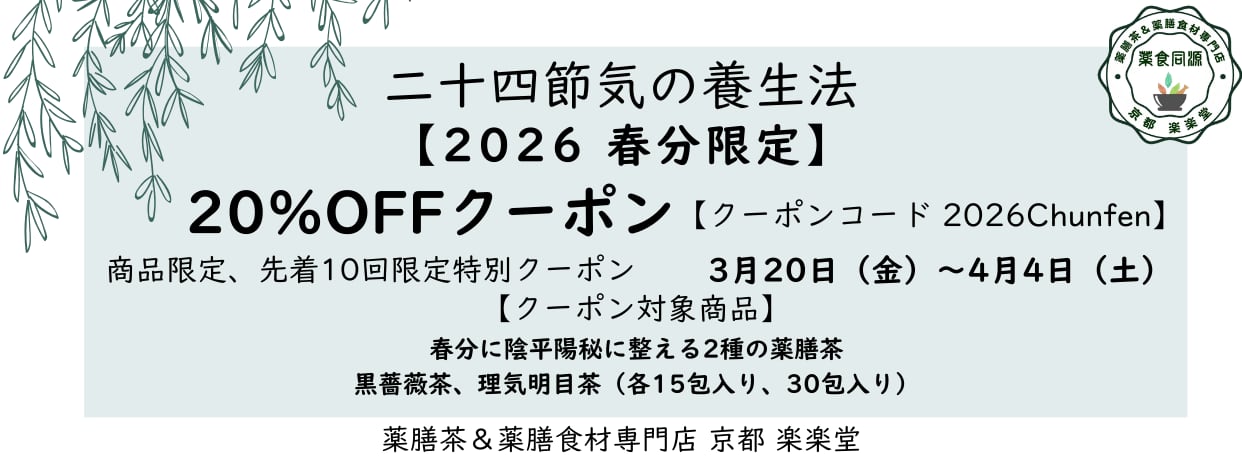 ストレスと花粉の季節に。肝の巡りを整える、春の薬膳茶。 【春のゆらぎとストレスを軽やかに整える】 春にぴったりの薬膳ブレンド「理気明目茶」は、黒豆茶をベースに、枸杞の実・菊花・ミントを絶妙に組み合わせた一杯。中医学で「肝」と関係の深い季節=春に起こりやすい「気の停滞(肝鬱気滞)」を整え、心身をリフレッシュさせてくれます。 ストレスフルな毎日や、目・鼻まわりの不快感が気になる方におすすめ。さっぱりとした味わいと爽快感で、気持ちまで晴れやかに。 【気の巡りと目の疲れをいたわる一杯】 理気(気の巡りを整える)+明目(目の健康を助ける)をテーマにしたこのブレンドは、デスクワークで目を酷使する方、春の花粉症による目や鼻の違和感がある方にも◎。 黒豆茶の香ばしさに、菊花のすっきりとした風味、ミントの清涼感が絶妙にマッチ。枸杞の実のやさしい甘みが全体をまろやかにまとめてくれます。ノンカフェインで時間を選ばずお楽しみいただけます。 【こだわりのブレンド内容】 黒豆茶:補腎・活血。香ばしく身体をやさしく整える 菊花:清肝明目。目の疲れや充血、春のイライラに 枸杞の実:滋陰明目。目と肝の栄養補給に ミント(薄荷):清涼・理気。ストレスや不快感をリセット 香料・甘味料・着色料を一切使わず、自然の風味でやさしく調和されたブレンドです。 【このお茶がおすすめの体質タイプ】 中医学体質分類に基づき、「理気明目茶」は以下のタイプの方に特におすすめです: 気滞タイプ(ストレスが多く、イライラ・張り・喉のつかえなどがある方) 陰虚タイプ(目の疲れ、乾燥、寝つきの悪さが気になる方) あなたの体質を知りたい方は「今のからだを知る」からどうぞ 【飲み方】 1包をカップに入れ、熱湯200mlを注ぎ3〜5分蒸らしてください。 2〜3煎ほどお楽しみいただけます。ポット(約750ml)でも抽出可能です。 【内容量】 植物由来ティーバッグ30包入(1包あたり約4.9g) 総重量:約150g 【原材料】 黒豆茶、菊花、枸杞の実、ミント ※ノンカフェイン 【保存方法】 直射日光・高温多湿を避けて常温保存 ※風味保持・虫害防止のため冷蔵庫での保存をおすすめします 【注意点】 ●本品は医薬品ではありません。体質や体調に合わない場合は、使用をお控えください。 ●ミントが含まれているため、冷えが強い方はお身体の様子を見ながらお飲みください。 【生産加工地】 日本国内(京都市内)で一包ずつ丁寧に加工・包装 【送料】 追跡可能メール便で日本全国送料無料にて発送いたします。 ※ポスト投函・日時指定不可 【その他】 ●個人情報漏洩防止、資源環境保護の観点から納品書・領収書は同梱しておりません。必要な場合は備考欄にてお知らせください。 ●LINE公式に登録すると、ご注文・発送に関するご案内やフォローがスムーズになります。