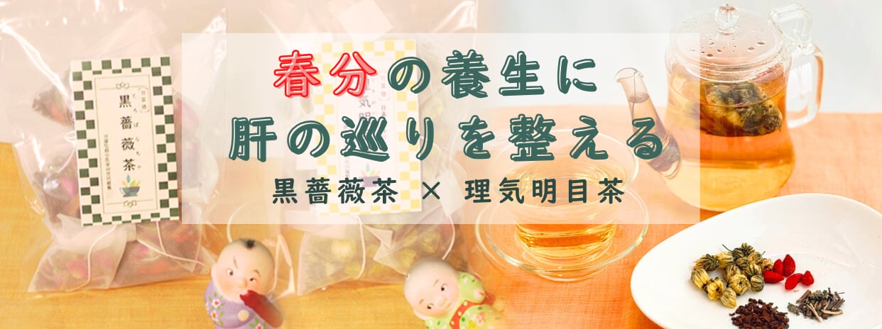 ベースの黒豆茶は穏やかな飲み口で巡りを助け、枸杞の実が肝腎を補い目の働きを支えます。菊花は目の不快感を整える食材として知られ、ミントの爽やかな香りが春に滞りがちな気をすっと巡らせます。