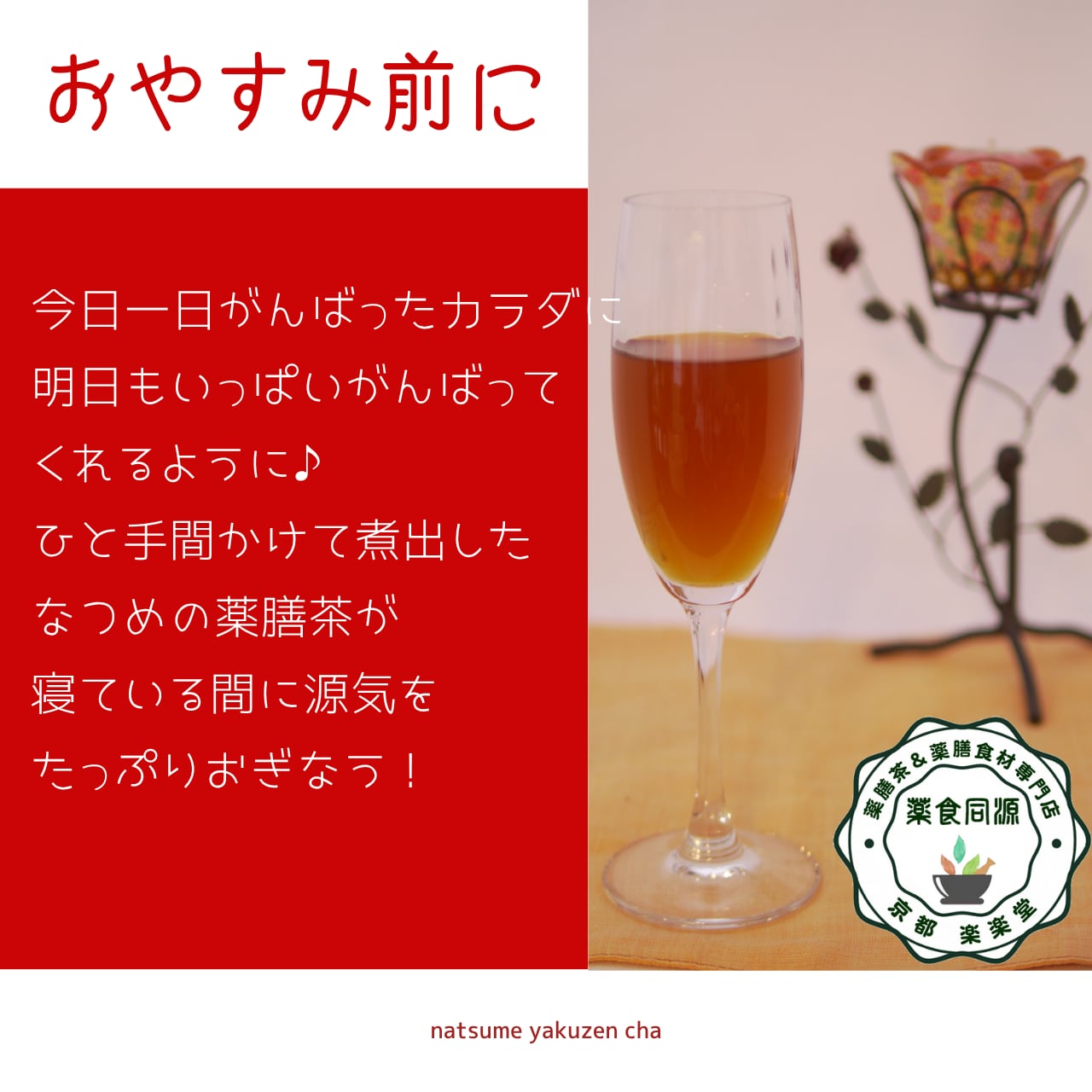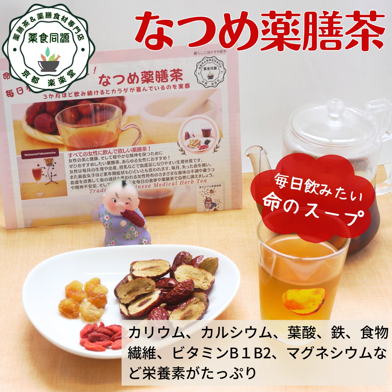 「なつめ薬膳茶」は、そんな女性の味方。中医学で“女性の宝果”と称される「なつめ」、美肌と免疫の源「枸杞の実」、そして心血を補う「竜眼」を贅沢にブレンドしました。煮出して飲むことで、有効成分がタップリ抽出され、はやく吸収されるので、しっかり気血を補いやさしく巡りを整えます。