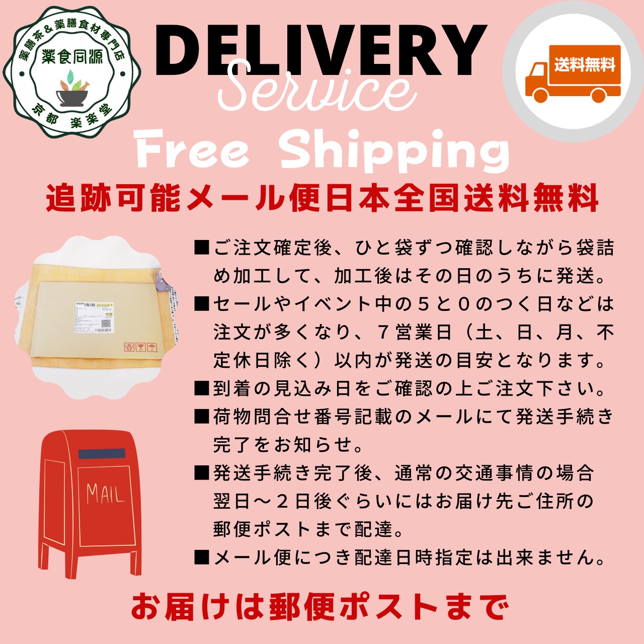 ●お届けは配送先ご住所のポストまでとなります。配達日時指定は出来ません。
