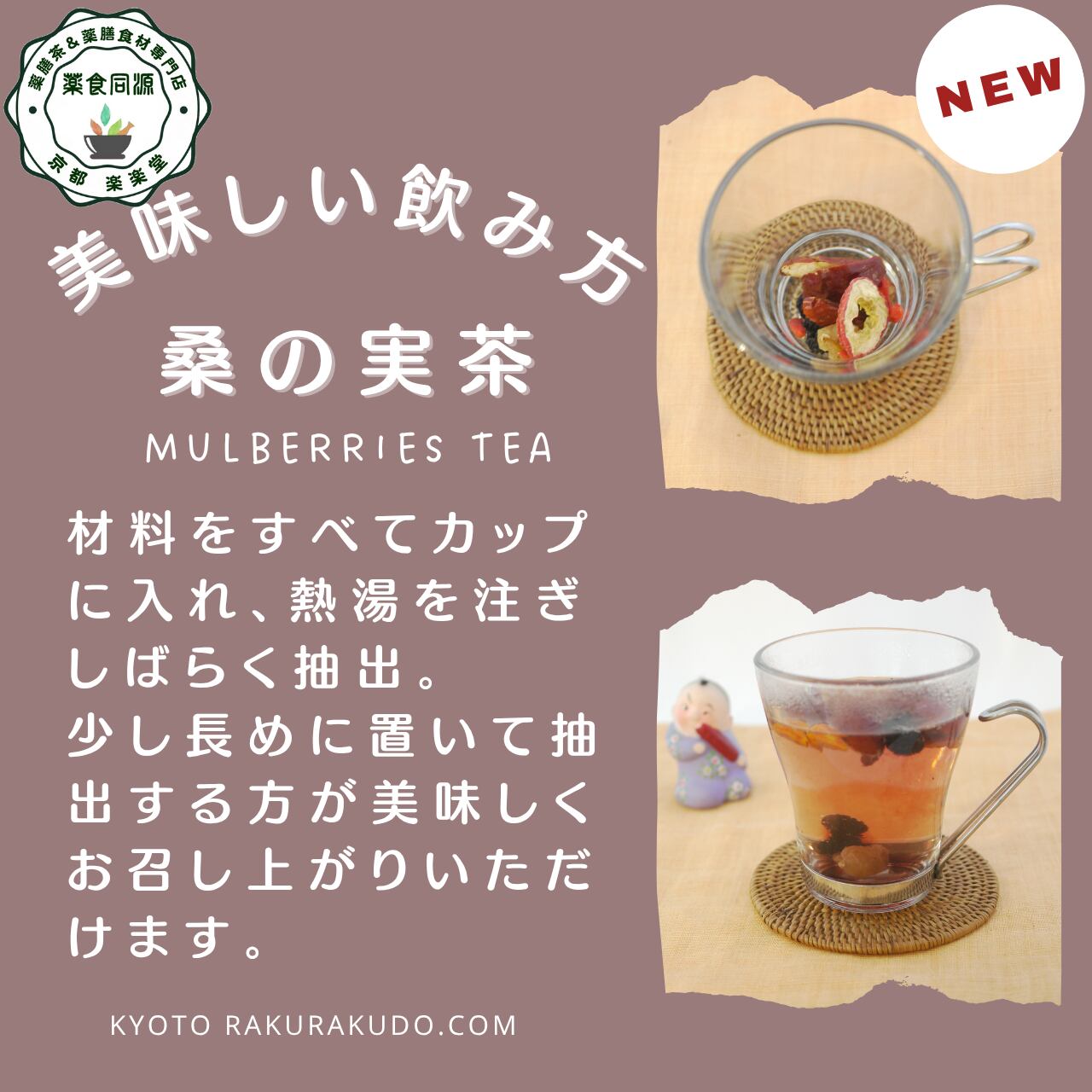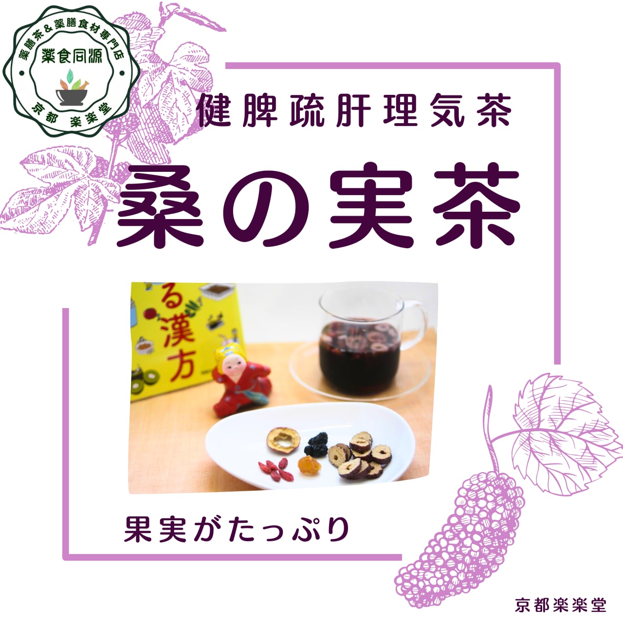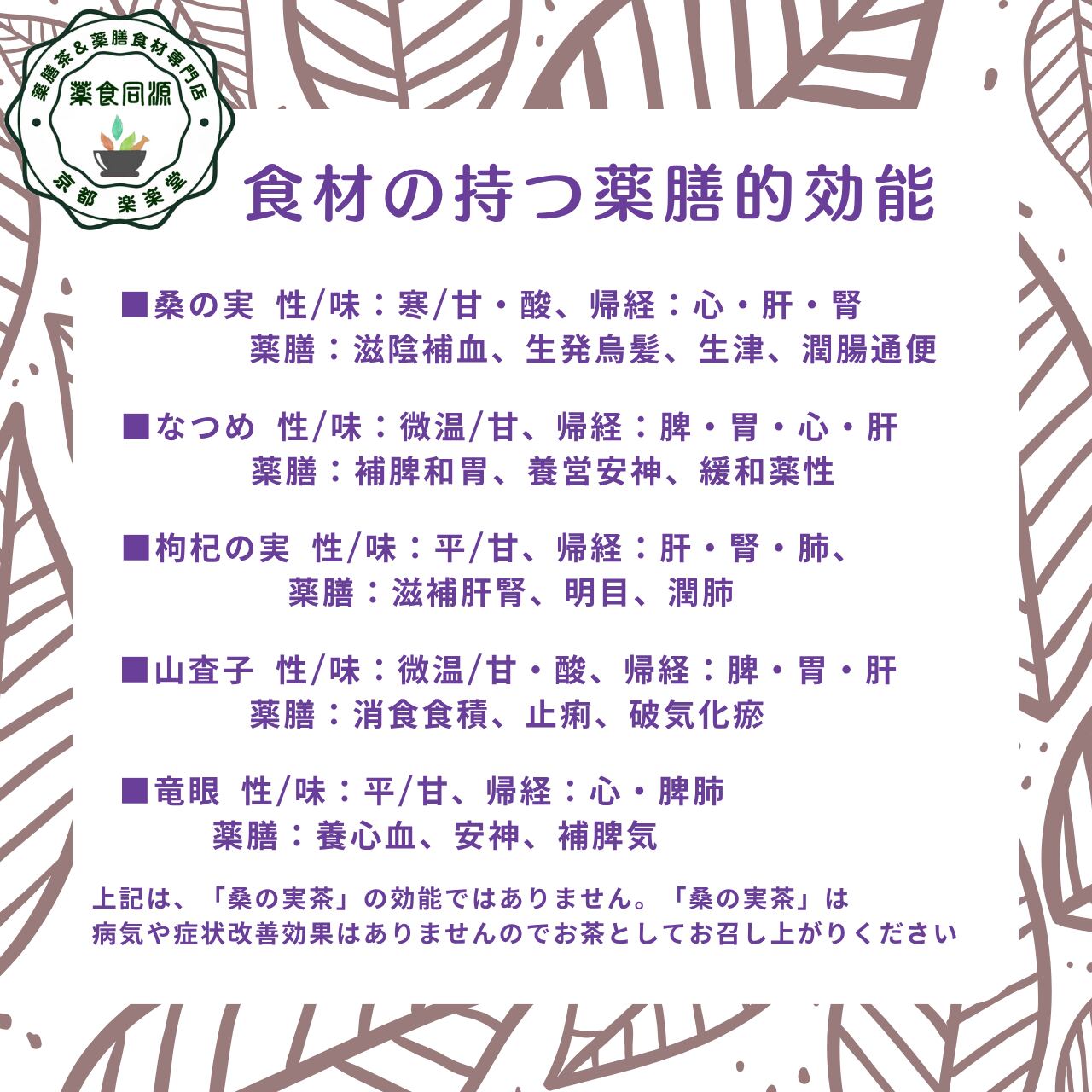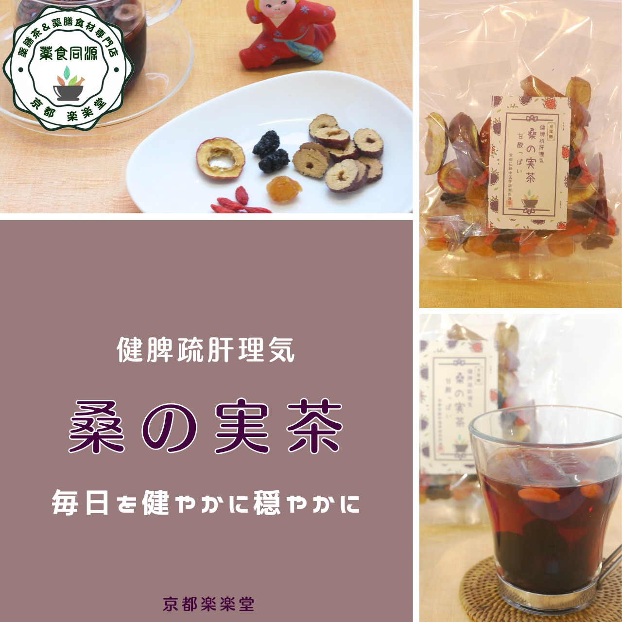 「桑の実茶(くわのみちゃ)」は、桑の実・枸杞の実・なつめ・山査子・竜眼をたっぷりブレンドした、肝と脾の調和を整える養生茶。