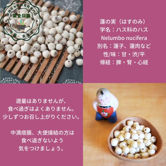 蓮の実は、スイレン科のハスの種子で、古くから漢方薬や薬膳の世界で「蓮子(れんし)」として用いられてきました。根は蓮根、葉は荷葉、種は蓮肉…と、すべてが使える“捨てるところのない”神秘の植物・蓮。その種子である蓮の実は、脾・腎・心を補い、精神を安定させ、滋養強壮にもすぐれた力を持つとされています。