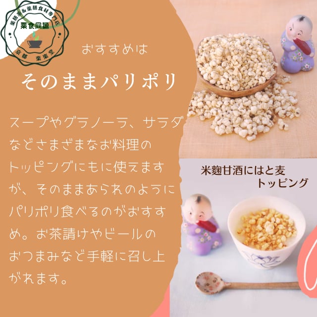 香ばしく炒ったラオス産はと麦。水の巡りを整え、肌・髪・腸にもやさしい美容と利湿の味方。