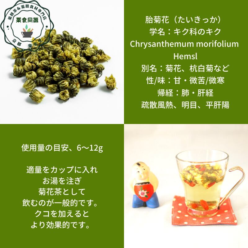 中医学では、胎菊は「肝」と「肺」に帰経し、**疏風清熱(風邪や熱を冷ます)、明目(目のケア)、解毒(体内の不要な熱や毒素の排出)、滋陰(体の潤いを補う)**などの効能があるとされています。