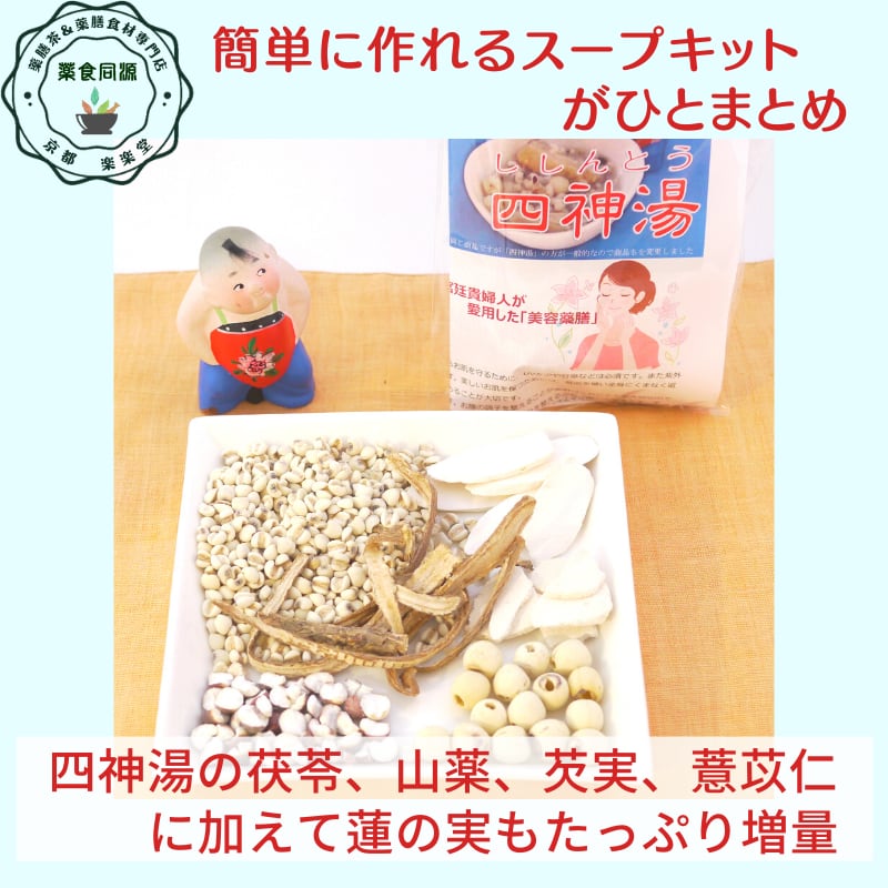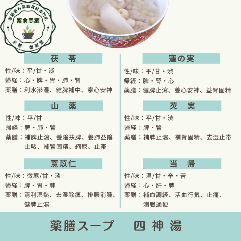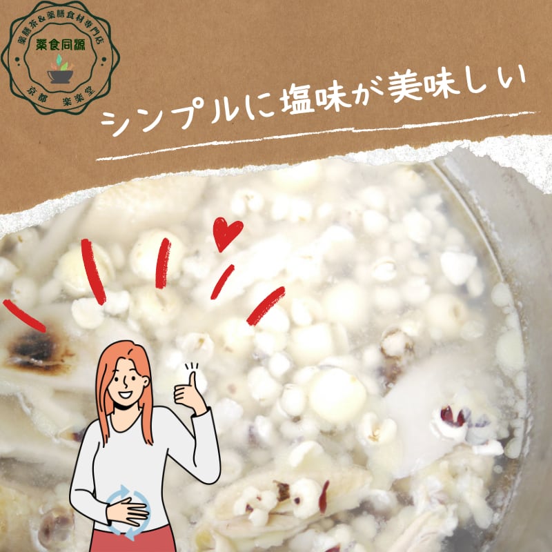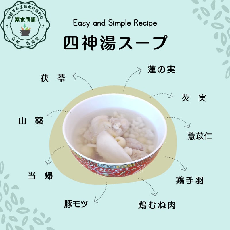 四神湯は、中医学でいう「脾肺双補(ひはいそうほ)」のスープ。暑さで食欲が落ちる季節や、便秘・むくみ・疲れがちなときの滋養にぴったりです。
