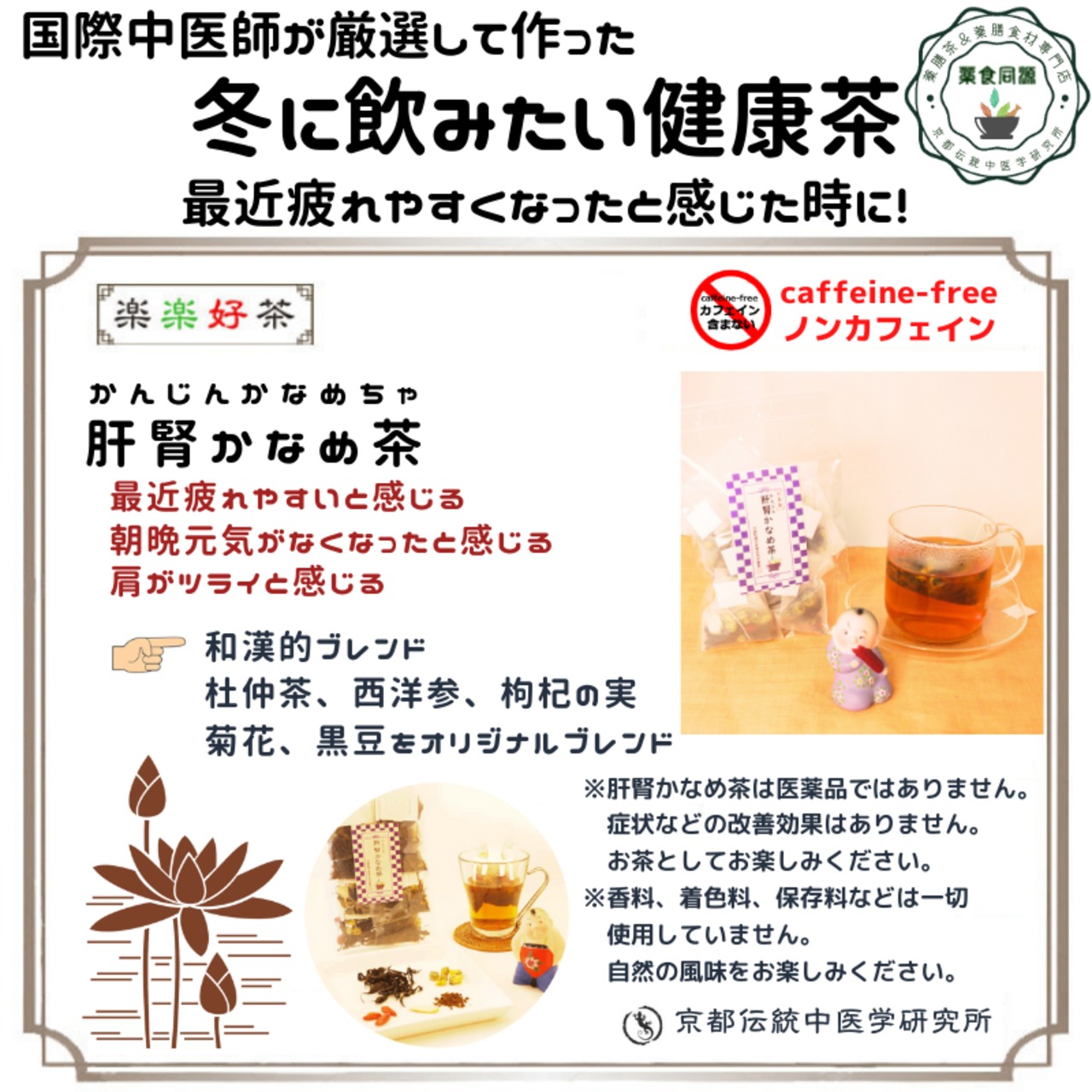 腎を補う黒豆、血の巡りを助けるナツメ、肝血を養う枸杞の実、清熱補肝の菊花などを加え、五臓のバランスをやさしく整える設計です。