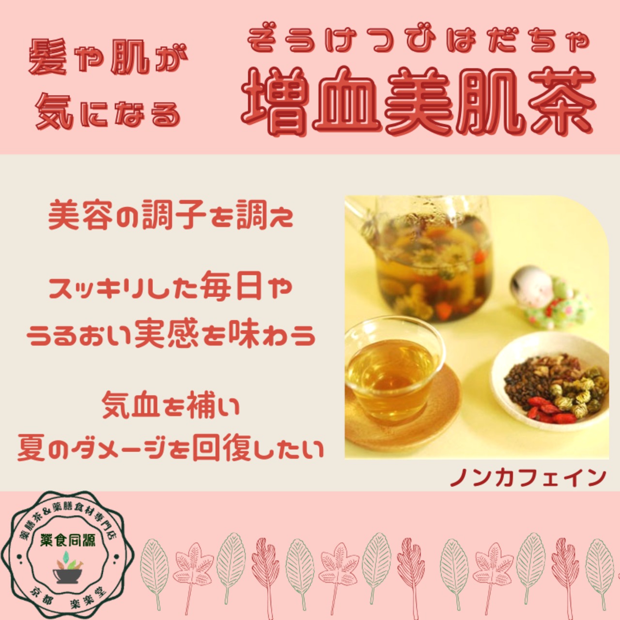 「増血美肌茶」は、夏の紫外線や暑さでダメージを受けた肌や髪を、内側からしっかりとケアするための薬膳ブレンドです。