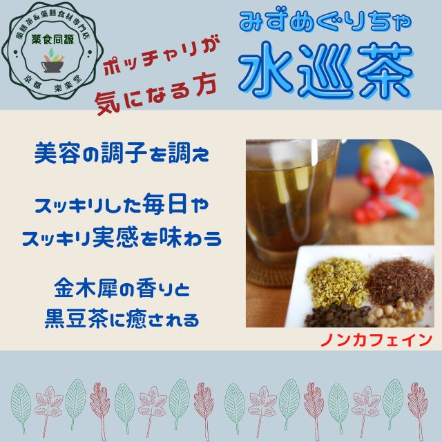 むくみや便通、体重管理が気になる方におすすめの「水巡茶」。中医学の知恵をもとに、水の巡り(利水)を整える素材をバランスよくブレンドしました。とうもろこしのひげ、桂花(キンモクセイ)、炒りはと麦(薏以仁)、黒豆 —— 香料・甘味料不使用で、自然そのもののやさしい味わいをお楽しみいただけます。毎日のリズムを整え、すっきりとした一日をサポートします。