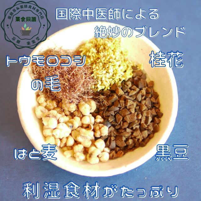 とうもろこしのひげ(玉米鬚)、炒りはと麦(薏以仁)、黒豆、桂花(キンモクセイ)を使用。中医学では利水・健脾・芳香化湿をテーマにした構成で、内側から水のバランスを調えてくれます。ノンカフェインなので、就寝前にも安心。