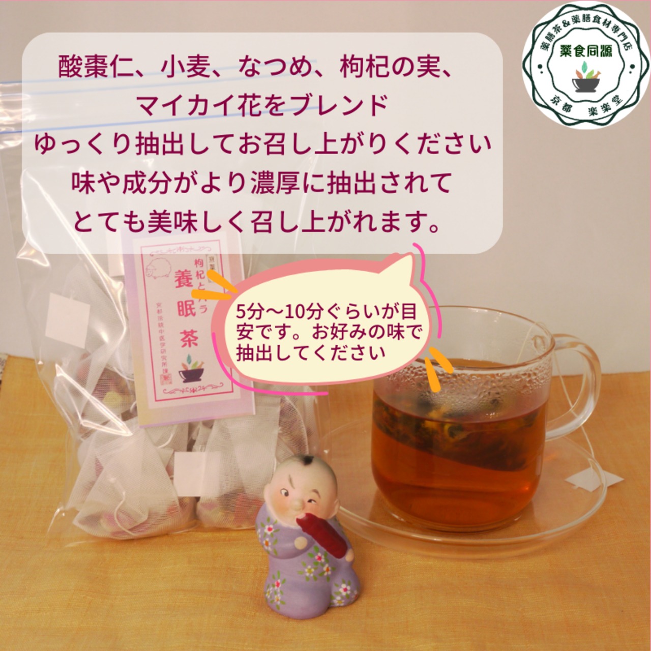 心(しん)を落ち着け、陰を補い、体の内側から眠れるリズムを取り戻してくれる養生茶です。