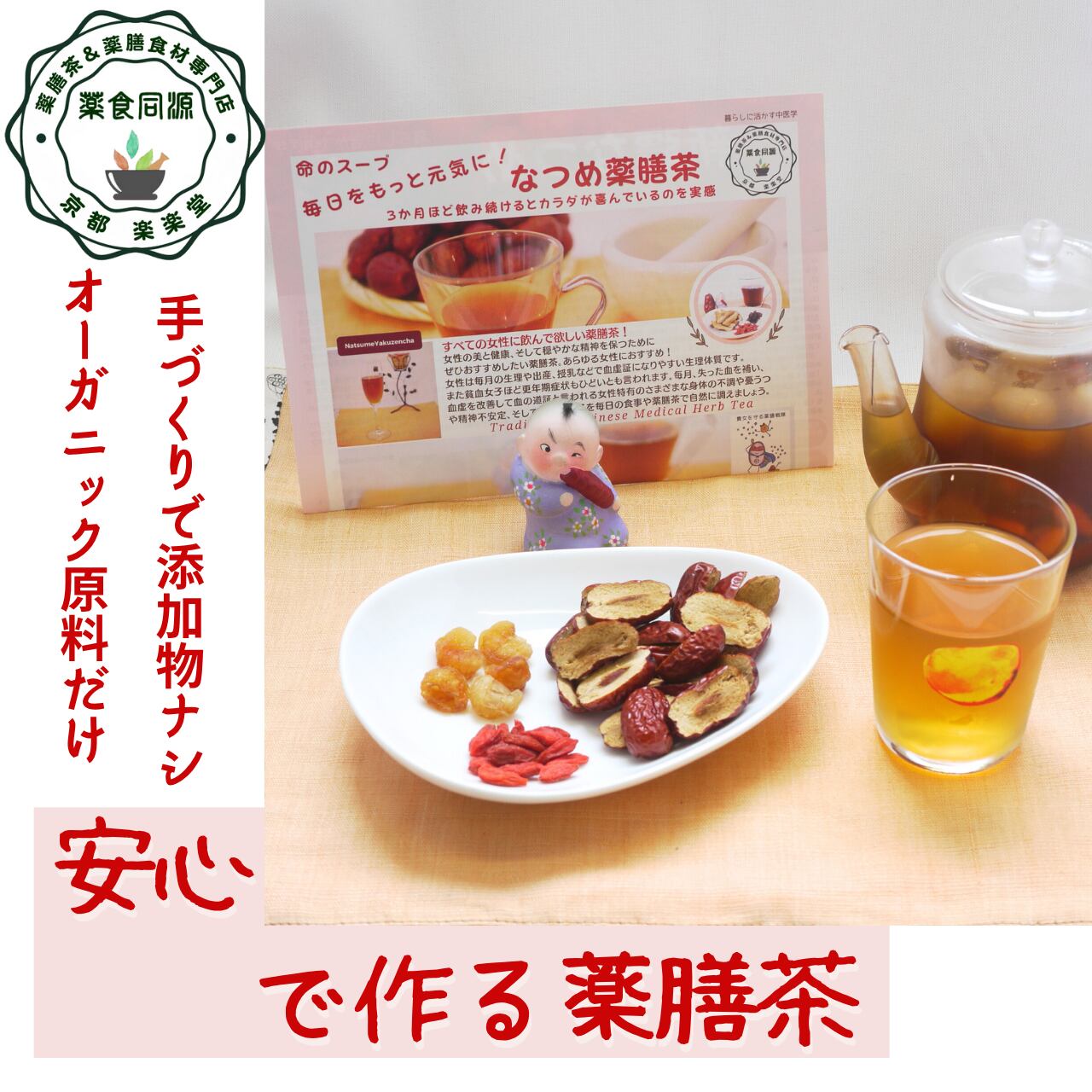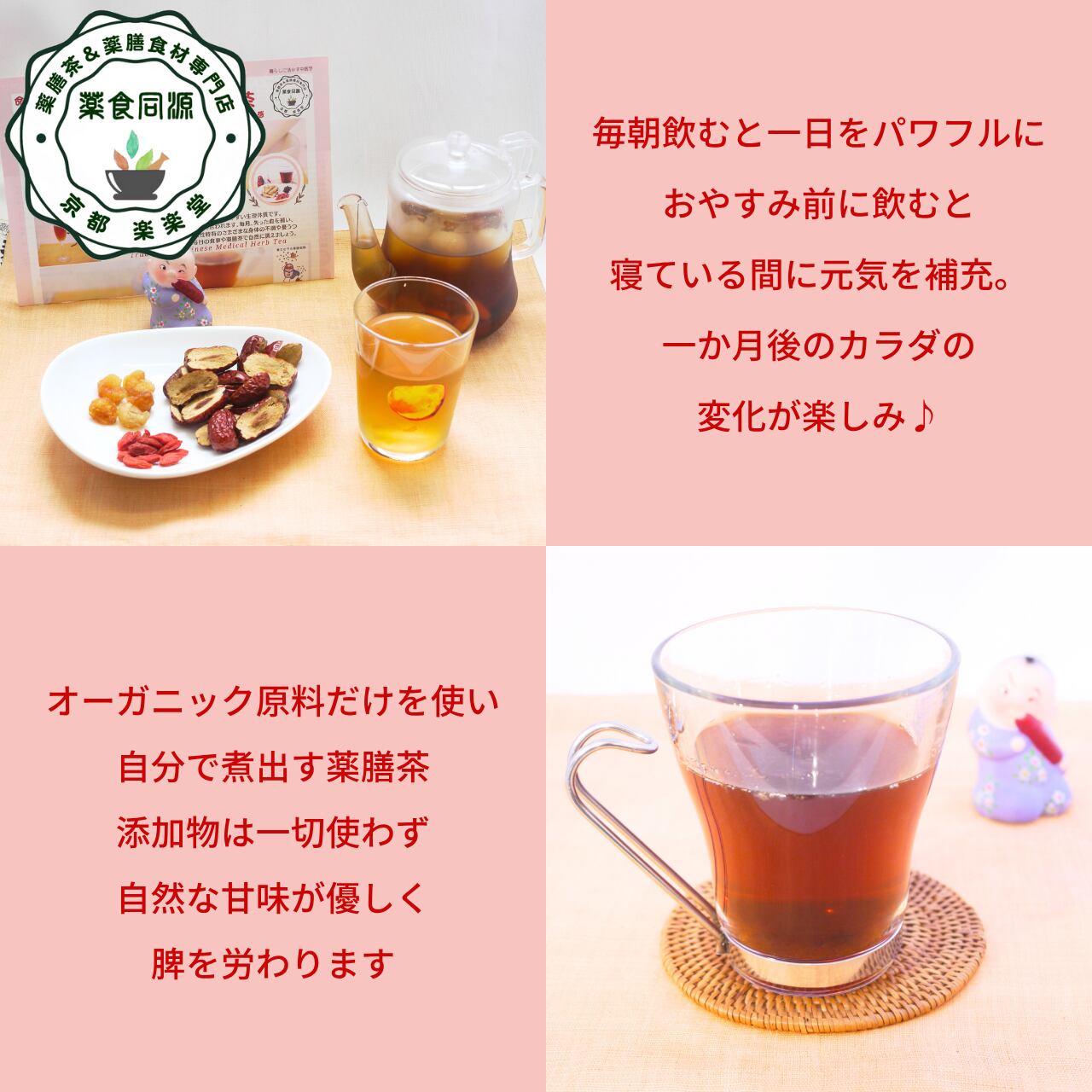 「なつめ薬膳茶」は、そんな女性の味方。中医学で“女性の宝果”と称される「なつめ」、美肌と免疫の源「枸杞の実」、そして心血を補う「竜眼」を贅沢にブレンドしました。煮出して飲むことで、有効成分がタップリ抽出され、はやく吸収されるので、しっかり気血を補いやさしく巡りを整えます。