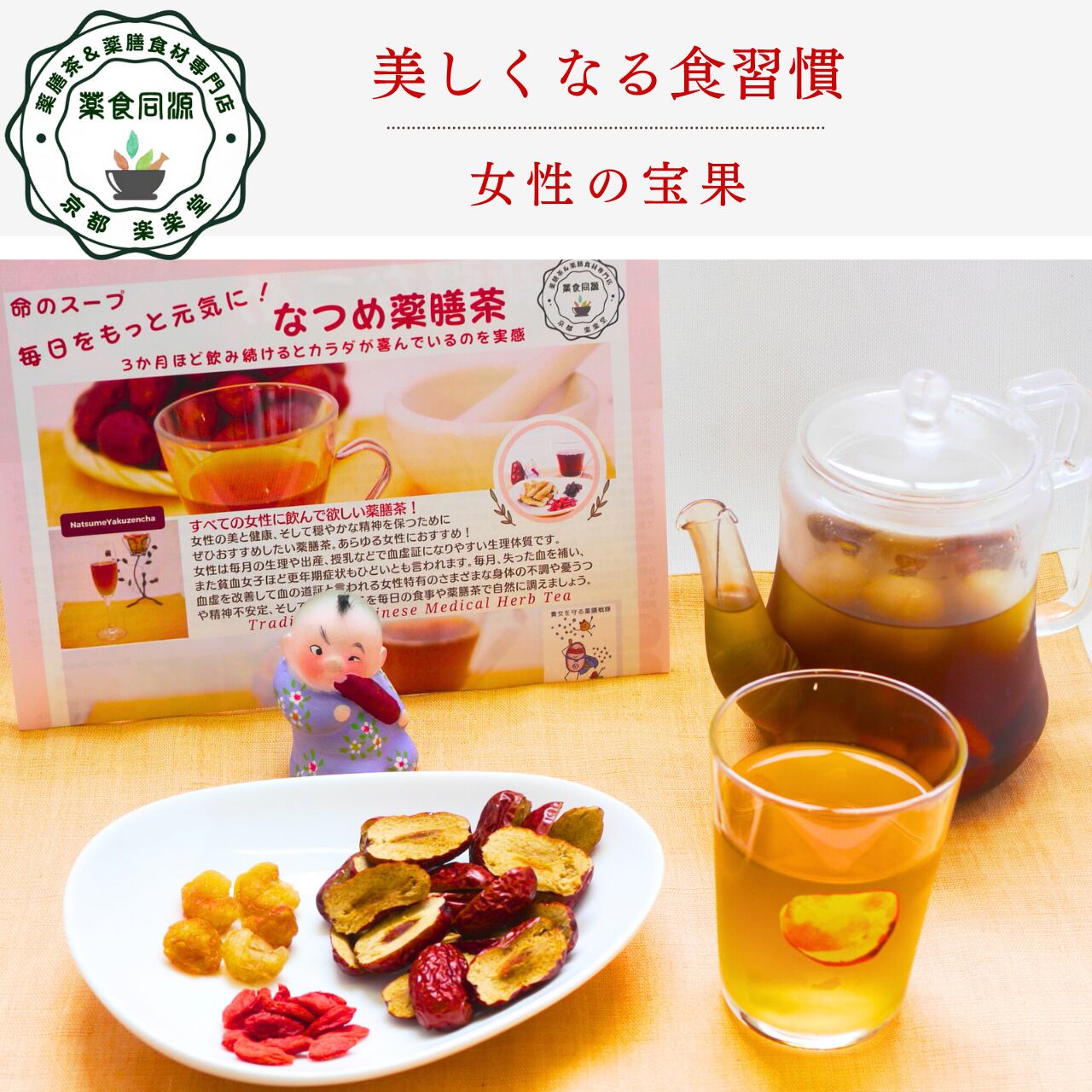 なつめ(新疆産香甜紅棗)、枸杞の実(寧夏産オーガニック)、竜眼(福建省産化学農薬不使用)