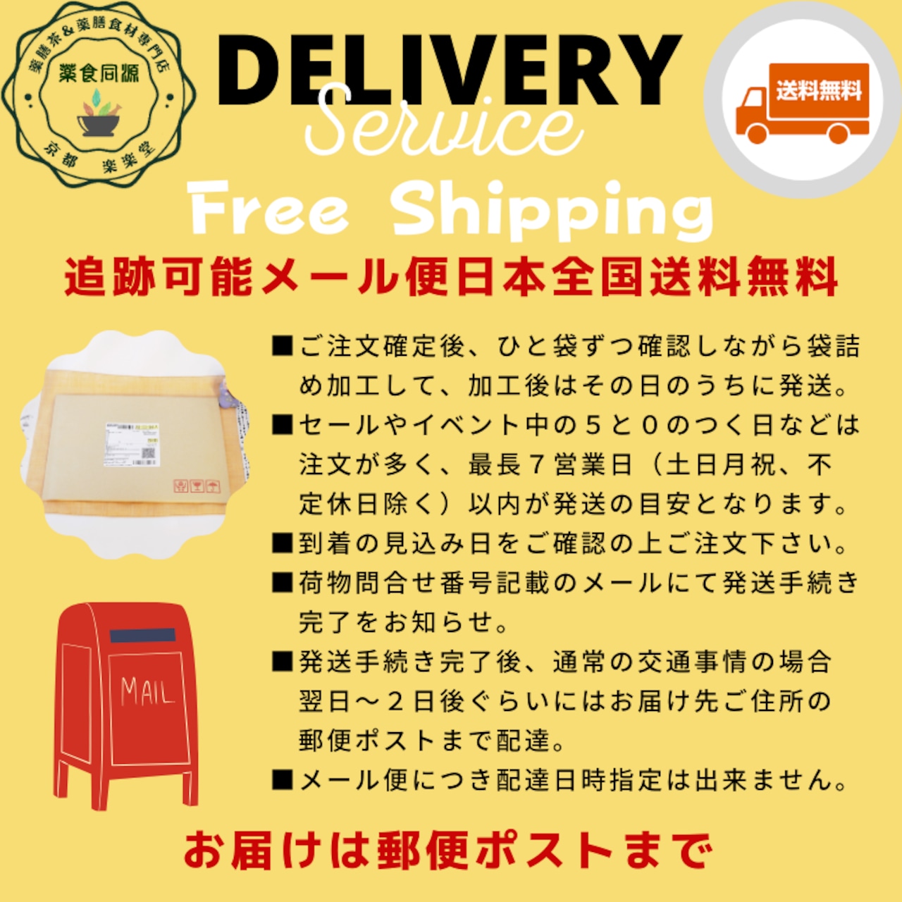 追跡可能メール便で日本全国送料無料にて発送いたします。