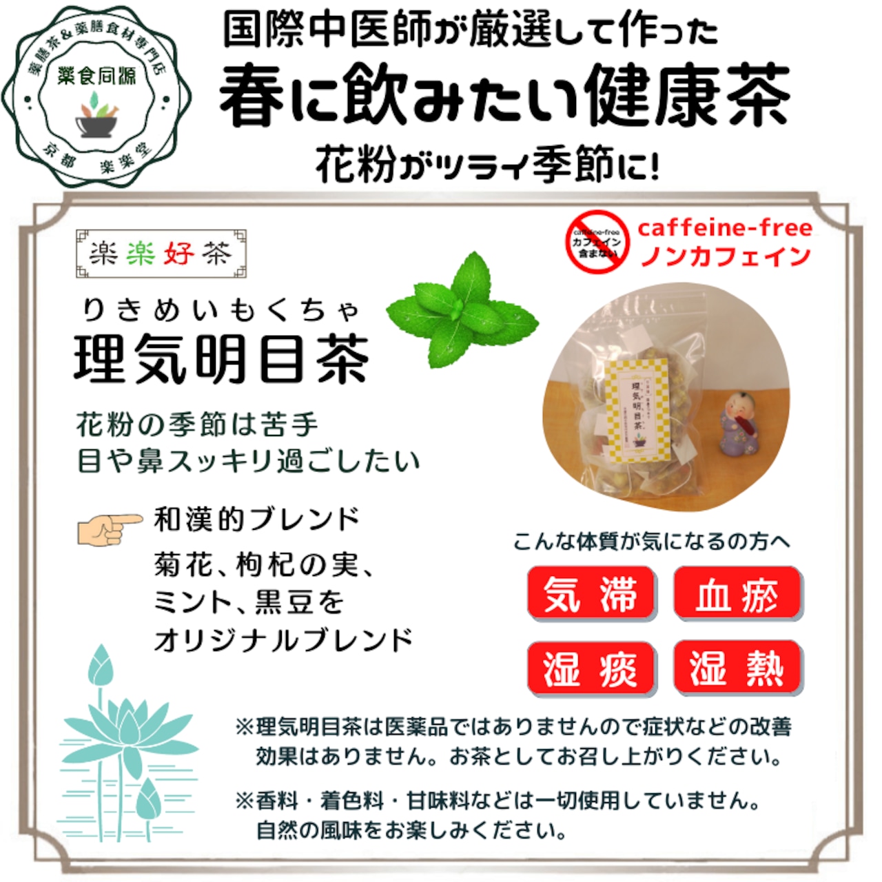 理気(気の巡りを整える)+明目(目の健康を助ける)をテーマにしたこのブレンドは、デスクワークで目を酷使する方、春の花粉症による目や鼻の違和感がある方にも◎。