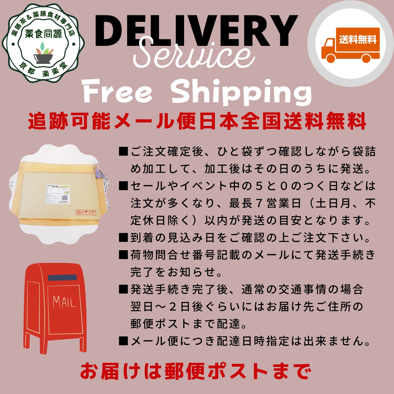●お届けは配送先ご住所のポストまでとなります。配達日時指定はできません。
