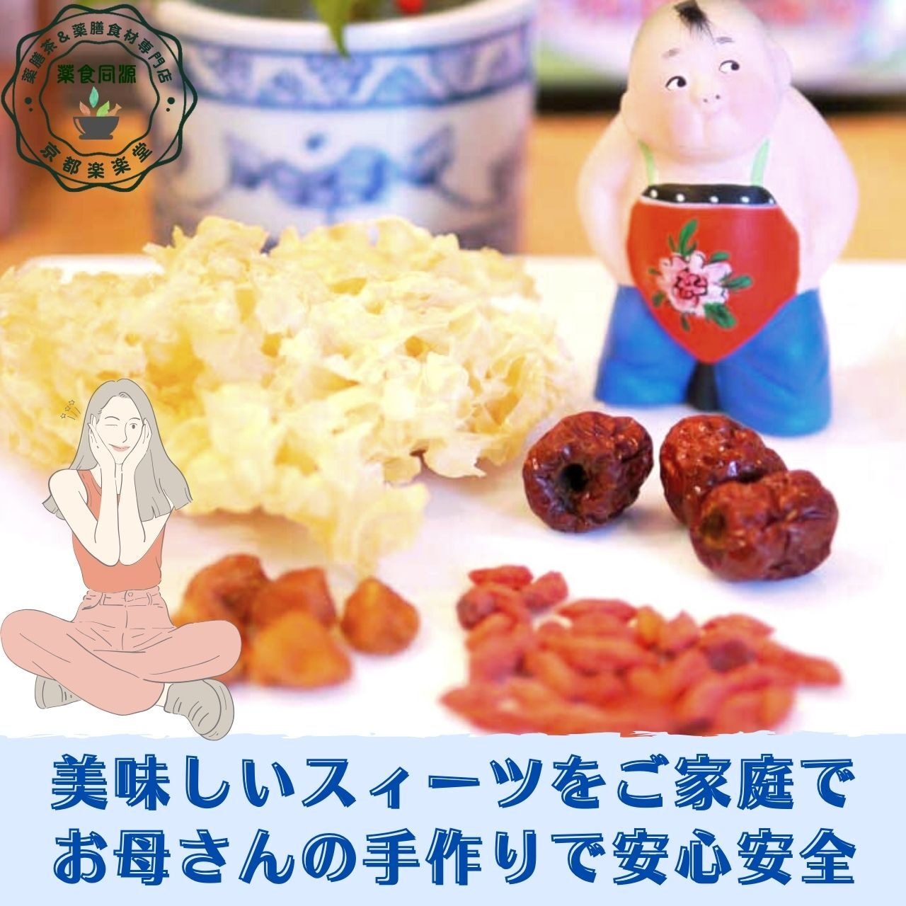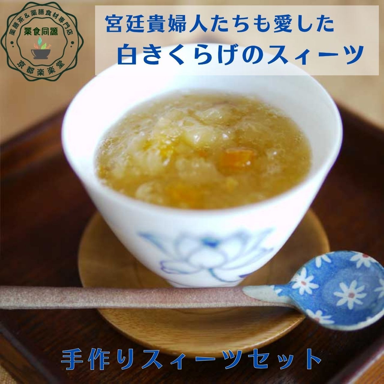 白きくらげ、なつめ、クコの実、竜眼肉の4種をブレンドした、美容と潤いのための薬膳スィーツセット。