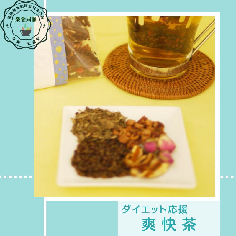 「爽快茶」は、消化を促し、気の巡りを整えるとされる決明子・山査子・マイカイ花・薄荷(はっか)・陳皮を使用。香料・着色料・甘味料は一切不使用。植物由来のティーバッグに包まれた、体にやさしいナチュラル処方です。