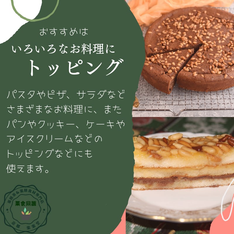 そのまま食べても、軽くフライパンで炙っても美味しくお召し上がりいただけます。焦げやすいため加熱はごく軽く。お粥、サラダ、スープ、パスタ、ミックスナッツやグラノーラのトッピングにも最適です。