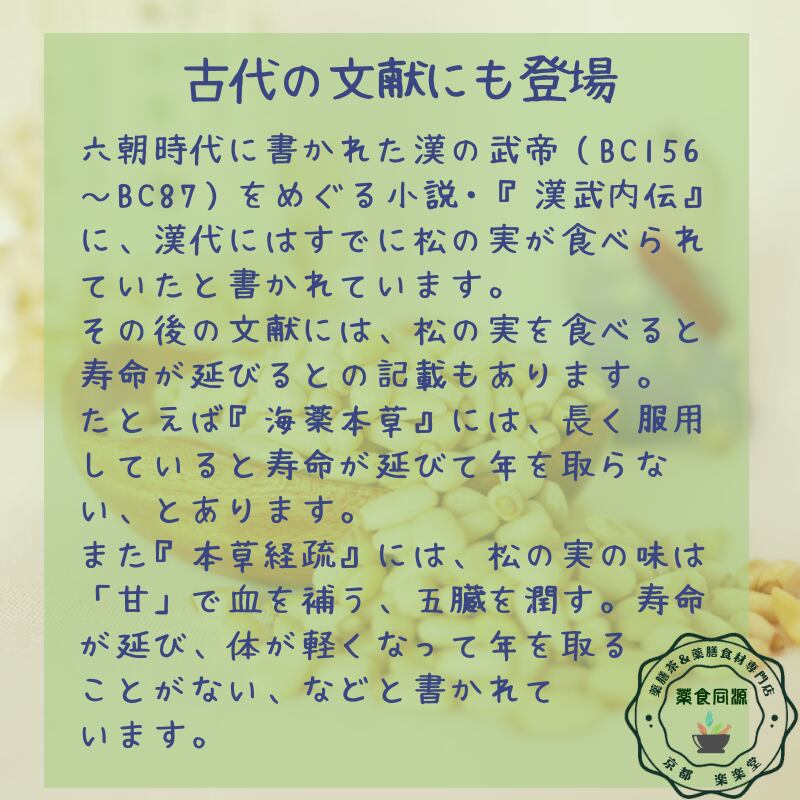 松の実は、中国語で「松子仁」「果松子」「海松子」などと呼ばれる、紅松(こうしょう)という松の木の種子です。中医学では古くから「仙人の食べ物」として珍重され、補益・潤肺・通便・美容効果などを目的に漢方薬や薬膳料理に広く使われてきました。