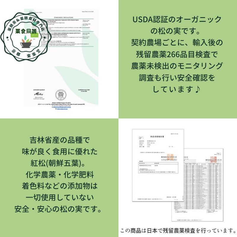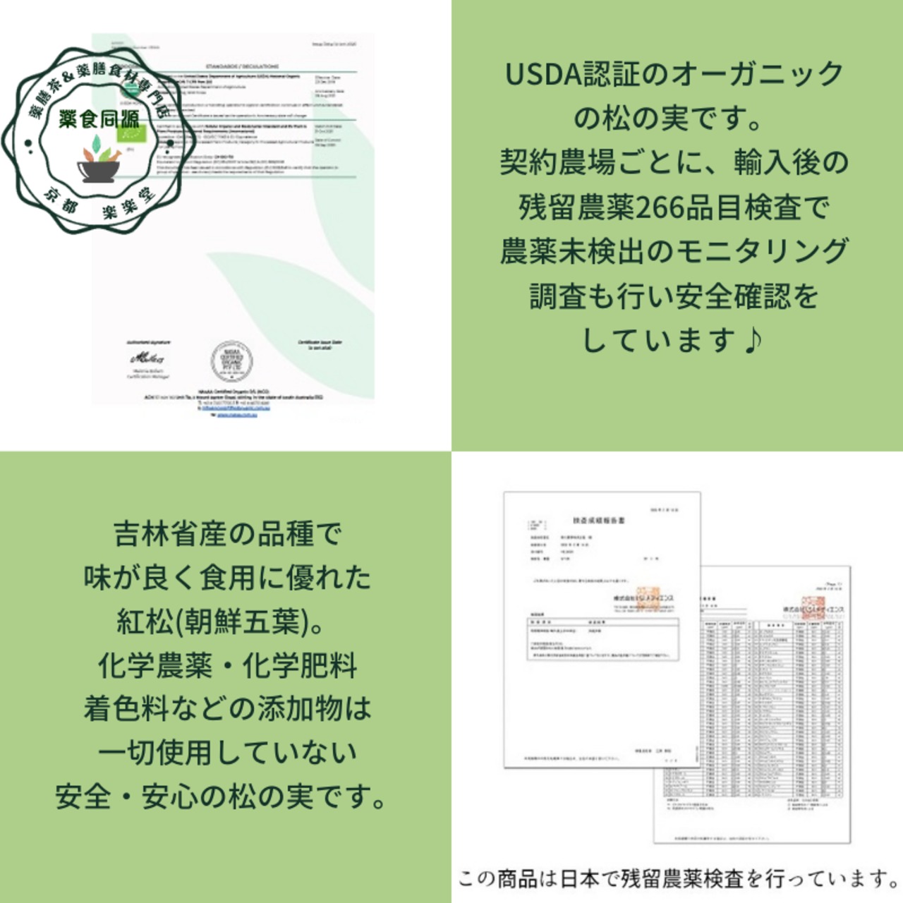 特に紅松の実は希少性が高く、1本の木から収穫できるようになるまでに約50年を要します。当店では、中国吉林省産の無農薬・USDA認証オーガニック原料の紅松(朝鮮五葉)を厳選。輸入後には266項目に及ぶ残留農薬検査を実施し、安全性を確認しています。