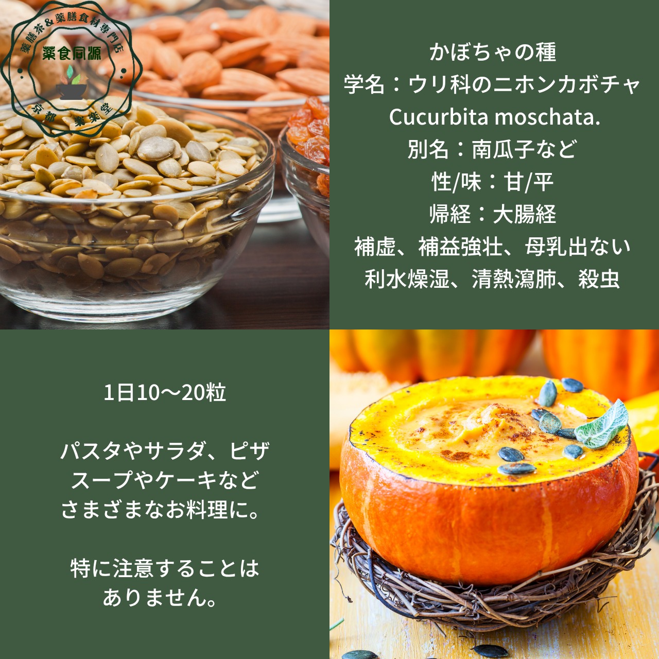 かぼちゃの種は、ウリ科ニホンカボチャの成熟した種子で、中国語では「南瓜子(なんかし)」と呼ばれます。中国東北部や内モンゴル自治区、雲南省などで収穫され、薬膳や生薬として広く用いられてきました。