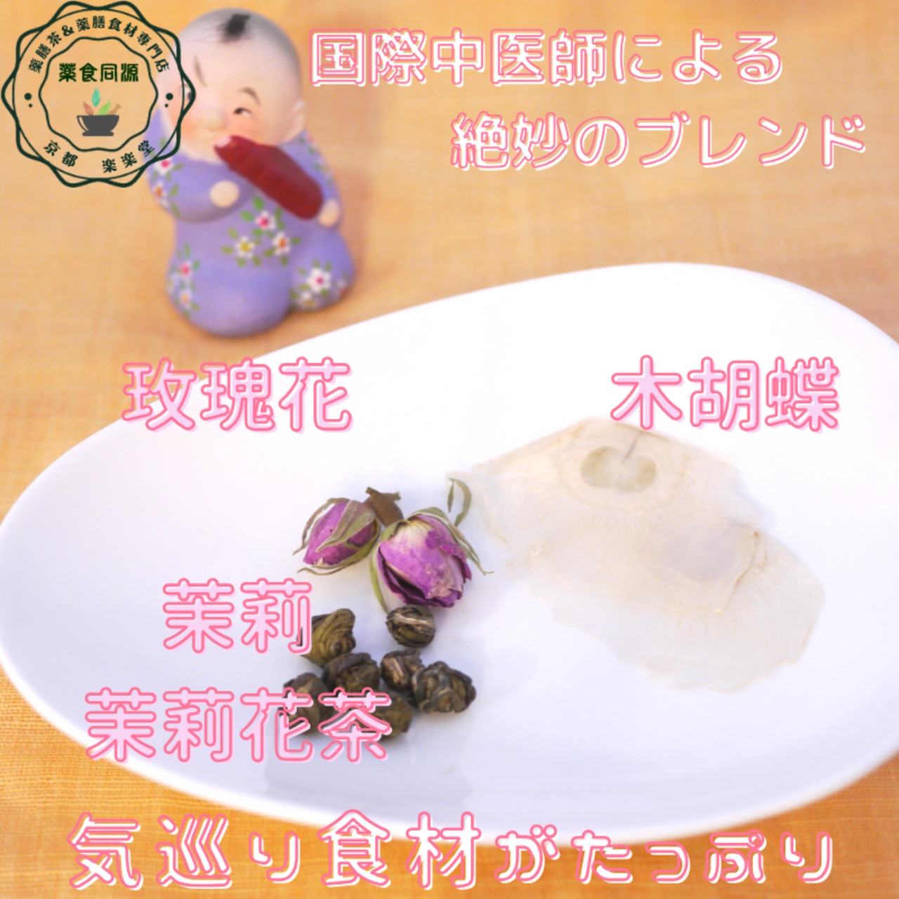 最高級の**茉莉茉莉花茶(ジャスミン茶)**をベースに、**マイカイ花(野ばらの蕾)と玉胡蝶(ノウゼンカズラの種子)**を組み合わせた、華やかで繊細な香りの薬膳花茶です。
